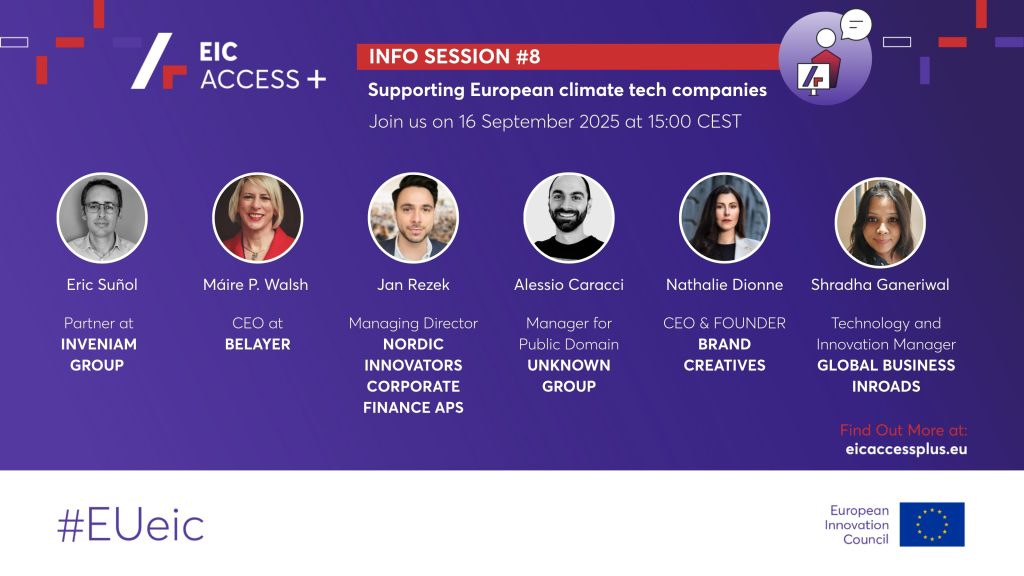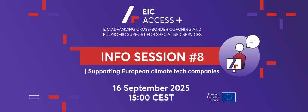 The EIC ACCESS+ Info Session #8, taking place online on 16 September 2025 at 15:00 CEST, will explore how tailored services from the EIC Service Catalogue can support European climate tech innovators, with co-funding of up to EUR 60 000 available through the EIC ACCESS+ grant. Designed for EIC beneficiaries and Seal of Excellence holders developing climate tech solutions, the session will feature EIC Partners offering specialised support for the climate tech sector.