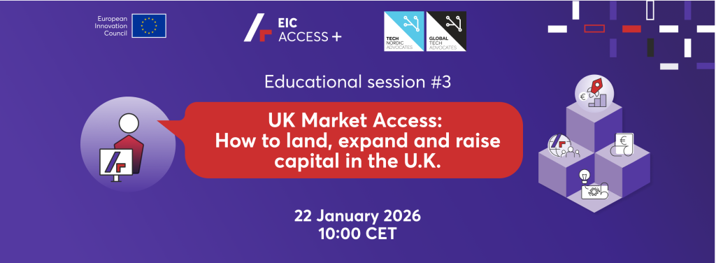EIC innovators are invited to join the EIC ACCESS+ Educational Session on the topic “UK Market Access: How to land, expand and raise capital in the U.K.”, taking place online on Thursday, 22nd January 2026 at 10:00 CET. This session, in collaboration with the EIC Ecosystem Partnership Programme, will offer you expert insights into the most efficient pathway to bring your innovations to the U.K. market and to raise private funding.