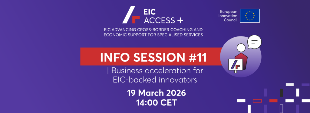 Ready to accelerate your growth? Join the EIC ACCESS+ Info Session #11 on 19 March 2026 at 14:00 CET to discover EIC Ecosystem Partners delivering  growth and scale-up support through the EIC Service Catalogue and learn how, as an EIC-backed innovator or Seal of Excellence holder, you can access co-funding covering up to 50% of service costs, up to EUR 60 000 per beneficiary, through the EIC ACCESS+ grant.